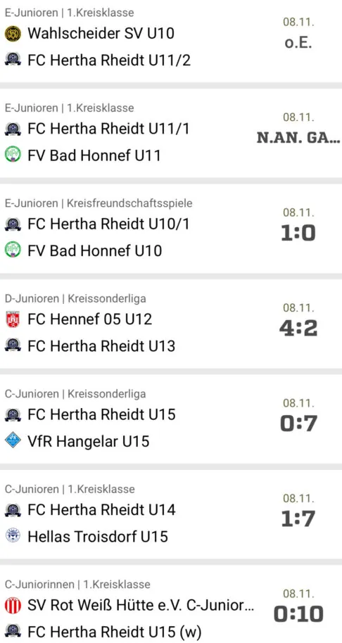Bereits am Donnerstag, den 7.11., traf die U10/1 der Hertha in der 1. Kreisklasse auf den SV Kriegsdorf U11/1. Das Spiel wurde ohne Wertung geführt. Einen Tag später ging es dann mit vollem Programm weiter. Beim Kinderfestival des VfR Marienfeld waren die jüngsten Herthaner, die U6, mit viel Begeisterung im Einsatz. Parallel dazu nahm auch die U7 am Kinderfestival teil und begeisterte mit großem Einsatz und vielen Toren. Hier stand ganz klar der Spaß am Spiel im Vordergrund. In der 1. Kreisklasse stand für die U11/2 ein Duell beim Wahlscheider SV U10 auf dem Programm, das ohne offizielles Ergebnis gewertet wurde. Auch das Spiel der U11/1 gegen den FV Bad Honnef U11 konnte nicht wie geplant ausgetragen werden. Erfolgreicher verlief es dagegen für die U10/1 im Kreisfreundschaftsspiel gegen die U10 des FV Bad Honnef: Mit einem knappen, aber verdienten 1:0-Erfolg belohnte sich die Mannschaft für eine engagierte Leistung und zeigte, dass sich die Trainingsarbeit der vergangenen Wochen ausgezahlt hat. Bei den D-Junioren musste sich die U13 in der Kreissonderliga trotz guter Leistung dem FC Hennef 05 U12 mit 2:4 geschlagen geben. Die Partie war über weite Strecken umkämpft, doch am Ende reichte es nicht ganz für einen Punktgewinn. Deutlich schwieriger hatten es die C-Junioren: Die U15 unterlag dem VfR Hangelar klar mit 0:7, während auch die U14 in der 1. Kreisklasse gegen Hellas Troisdorf U15 mit 1:7 das Nachsehen hatte. Beide Teams werden in den kommenden Wochen weiter hart arbeiten, um sich spielerisch zu stabilisieren. Ein echtes Ausrufezeichen setzten dagegen die C-Juniorinnen: Das Team der U15 (W) gewann ihr Auswärtsspiel bei Rot-Weiß Hütte souverän mit 10:0 und überzeugte auf ganzer Linie. Das Spiel der A-Juniorinnen gegen den SV Altenberg musste leider kurzfristig verlegt werden.