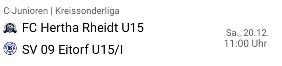 Im Anschluss sind die C-Junioren der U15 in der Kreissonderliga gefordert. Am Samstagvormittag tritt Hertha Rheidt auswärts beim SV 09 Eitorf U15/I an.