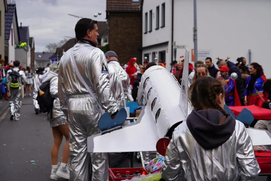 Unter dem Motto „Space Hertha“ und mit einem als Space-Shuttle gestylten Wagen zogen die Mädels als Astronautinnen verkleidet mit insgesamt ca. 150 Herthanern am Sonntagmorgen los. Spontan bauten die Jungs von „Vouloutakis Schweißtechnik“ nach einer Idee von Ihrem Chef Angelos und mit tatkräftiger Unterstützung seiner Tochter noch ein kleineres Space Shuttle, mit dem auch Kamelle abgeschossen werden konnten. In den Fenstern des Raumschiffes fanden sich die beiden Teams und Trainer wieder, abschussbereit, um auch das Weltall fußballerisch zu erobern.